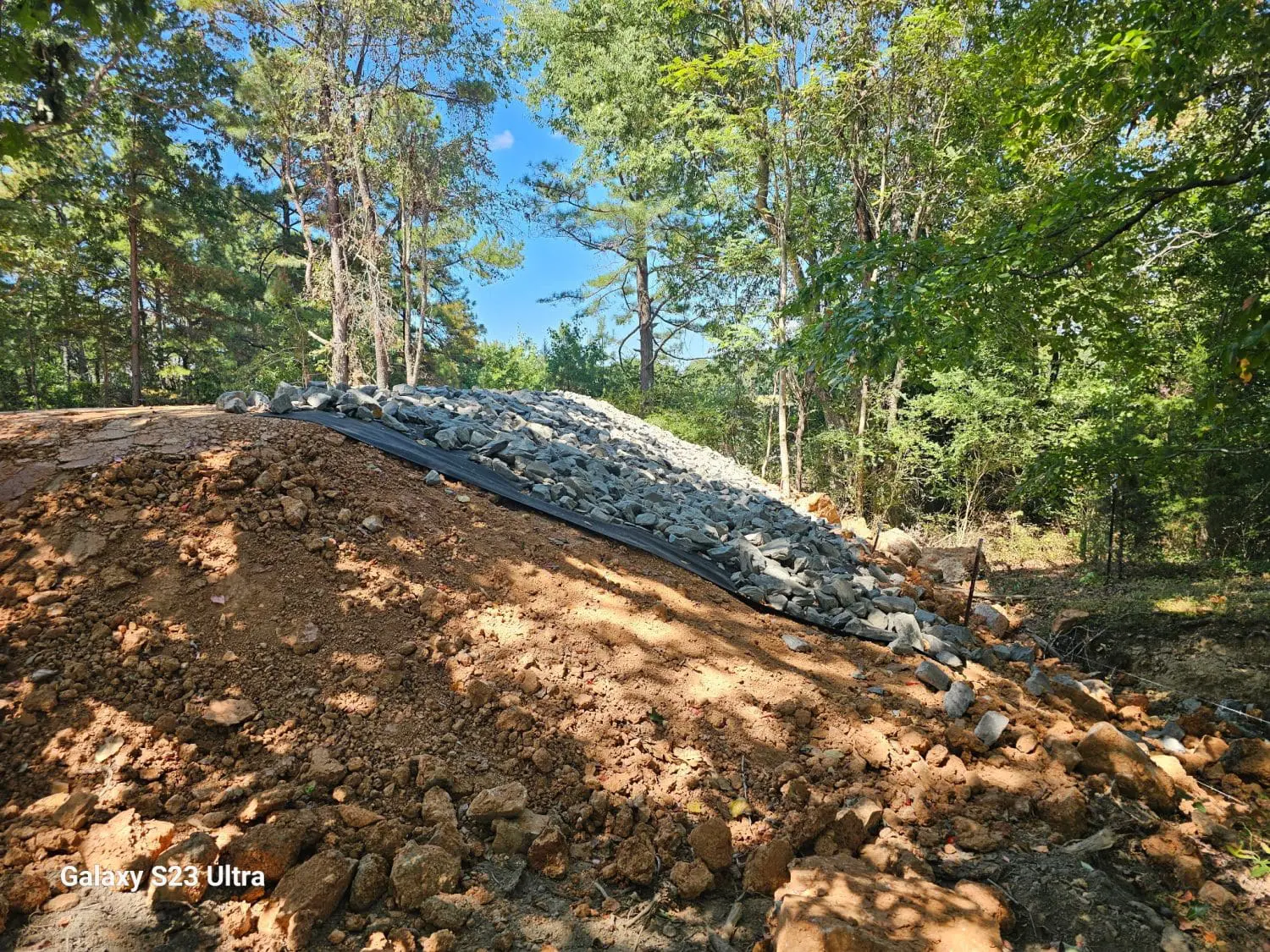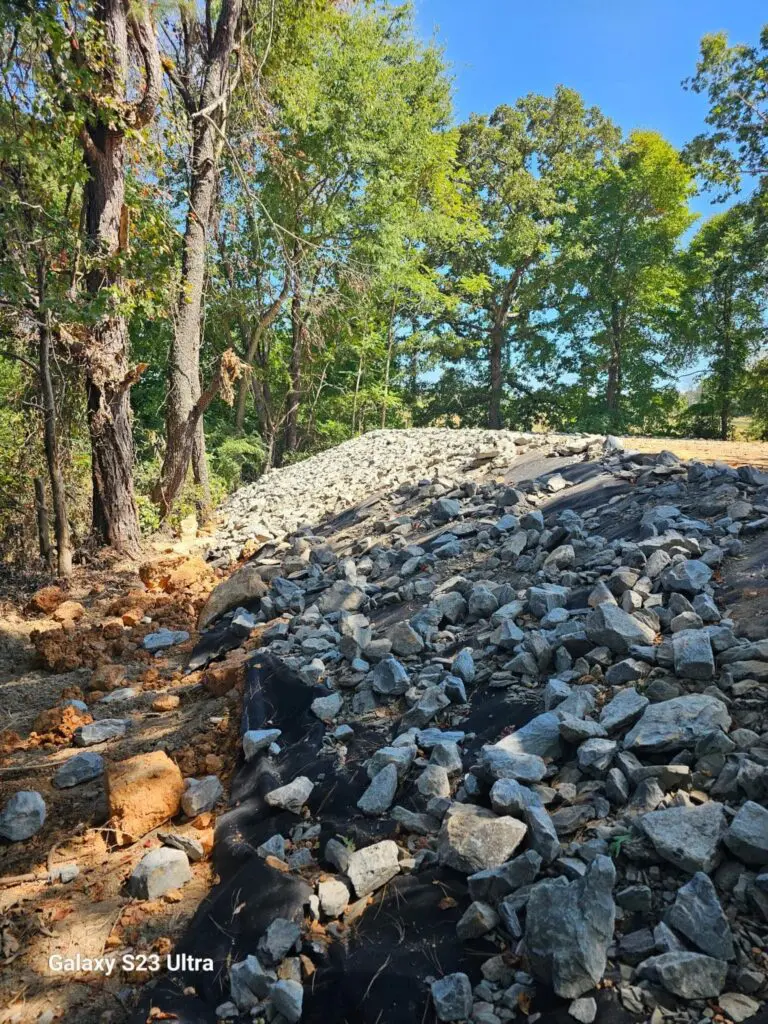 To protect the hillside from washing out, we installed geotextile fabric and rip rap stone along the slope. This combination allows water to flow freely while keeping the soil in place. In Tennessee, where we see plenty of heavy rain, erosion control is a key part of long-term site stability.