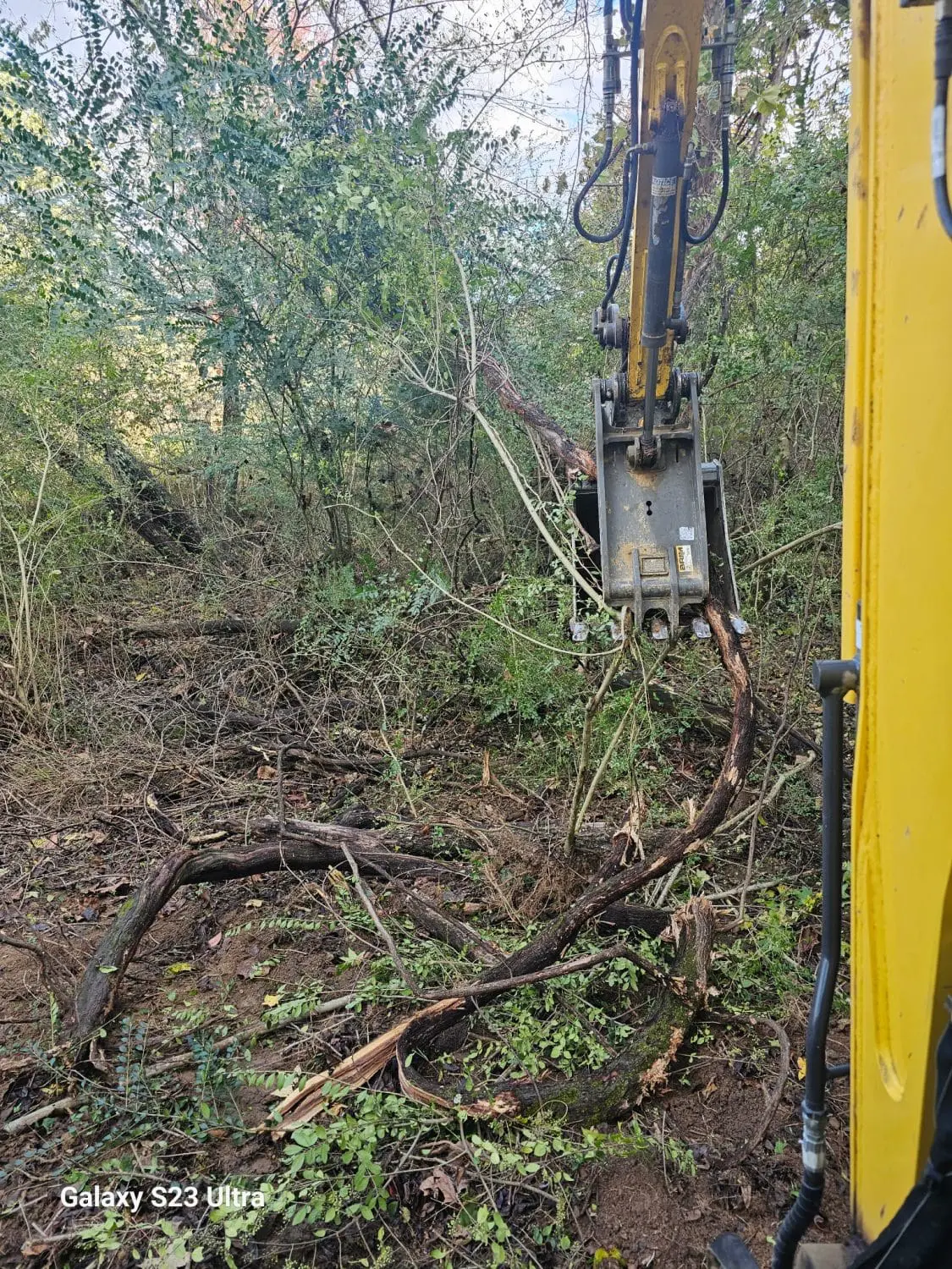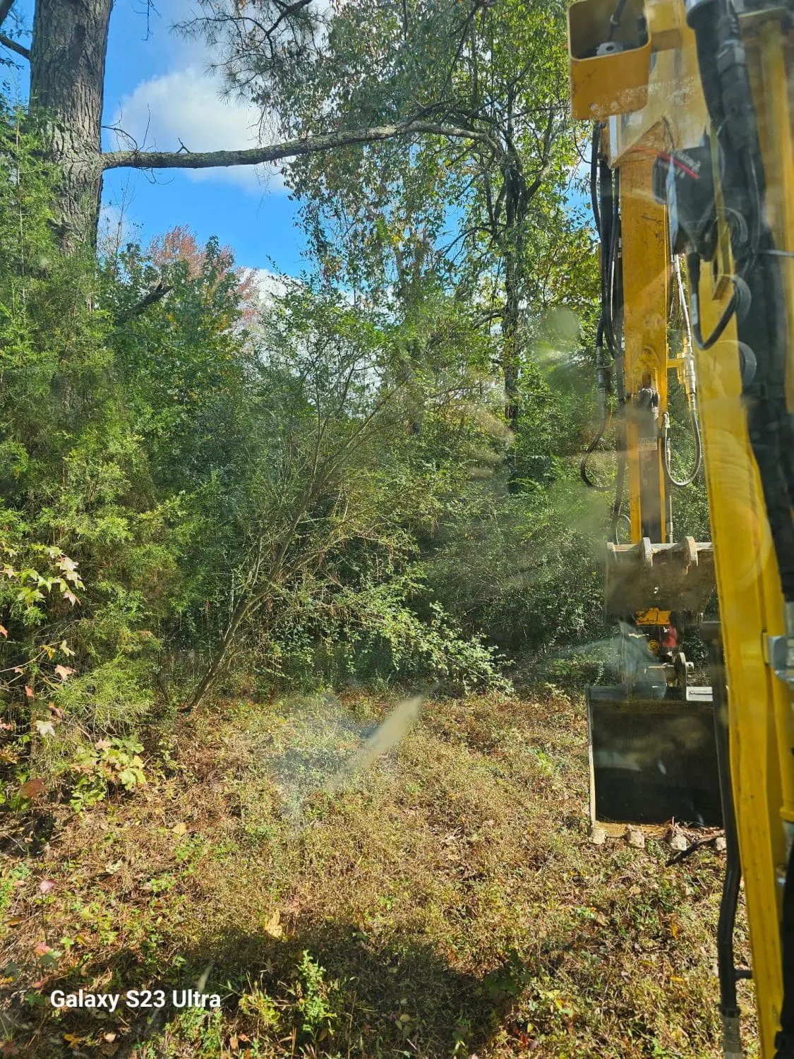 When we started this project, the area behind the lake was thick with overgrowth. You could barely see where the property ended, let alone get equipment through. The goal was simple — clear the land and make a path to bring power down to the shop.